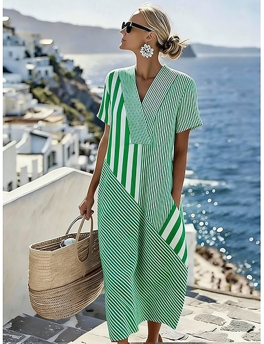 Dame Midikjole Solkjole Uformell kjole Ferie Fritid Strandstil Strand Fest Løstsittende Grafisk Geometrisk Kortermet V-hals Blå Svart Lilla Grønn Sommer Vår