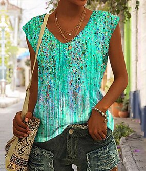 Dame Boho T-skjorte Bluse Trykt mønster Grafisk Geometrisk Årgang Stilfull Klassisk Ermeløs Kortermet V-hals Vanlige topper Daglig Blå Gul Rød Lilla Grønn Sommer Vår