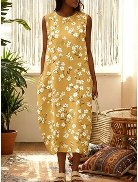 Dame Midikjole Imitert bomullslin Boho-kjole Skiftkjole Solkjole Årgang Daglig utendørs Feriereise Normal Blomstret Ermeløs Crew-hals Lys Rosa Gul Oransje Grønn Sommer Vår