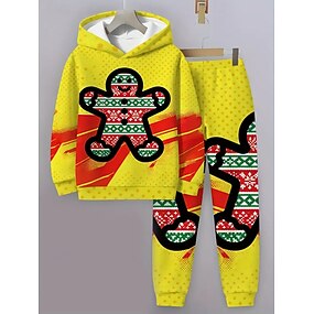 Jul Gutt 3D Grafisk Ruter Pepperkakemenn Julesett julegave Hettegenser og joggebuksesett Langermet Vår Høst Daglig Grunnleggende Fritid Barn 4 år + Med hette utendørs Feriereise Sport Skreddersydd