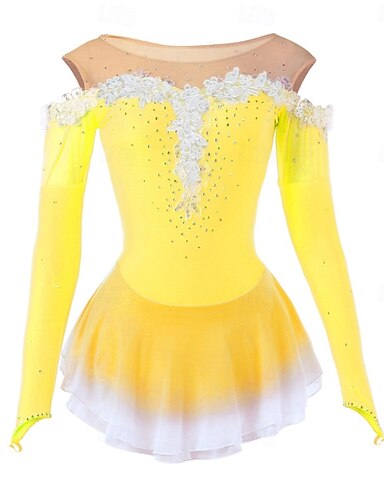 Kjole til kunstløp Dame Jente Skøyteløp Kjoler Gul Lapper Tommelhull Netting Spandex Elastisk Trening Profesjonell Konkurranse Skøyteklær Hold Varm Krystall / Rhinstein Langermet Skøyting Kunstløp