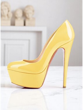dame gule stiletthæler i lakkskinn – dristige høyhælte sko med spiss tå og ankelstropp for urbane fester og uteliv