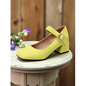 kvinners gule mary jane blokkhælpumper med rund tå og justerbar stropp for retrostil, kontorklær og formelle arrangementer