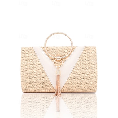 dameveske med halm clutch – elegant vevd veske med gullringhåndtak og dusk, boho chic kveldsveske for sommer, strand, ferie, bryllup og fest