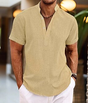 Herre Skjorte Linskjorte Popover skjorte Sommerskjorte Strand Klær Skjorte med bandkrage عادي Feriereise Avslappet Svart Hvit Gul Rosa Kortermet Henley Sommer Klær