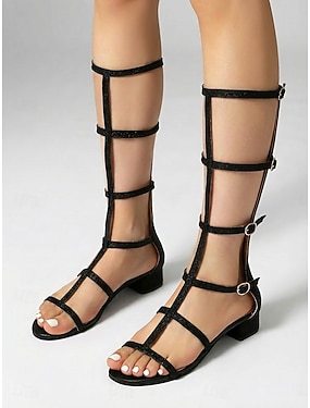 Knehøye gladiatorsandaler til dame – lavhælte sko med stropper i romersk stil, elegante sommersandaler for utendørsferie, resort- og reisetøy