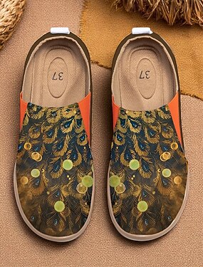 Komfortbare barfotsko for kvinner – kunstnerisk påfugltrykk, ergonomisk innersåle, livlig resortstil, flott for hjem, hage, kunstfestivaler og avslappede reisedager