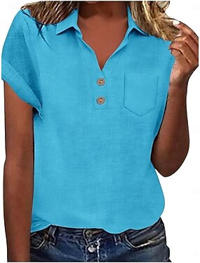 Dame Skjorte Bluse Imitert bomullslin Lomme Knapper عادي Årgang Stilfull Kortermet V-hals Vanlige topper Daglig Ferie Ut på byen Svart Rosa Himmelblå lysegrå Aprikos Sommer Vår