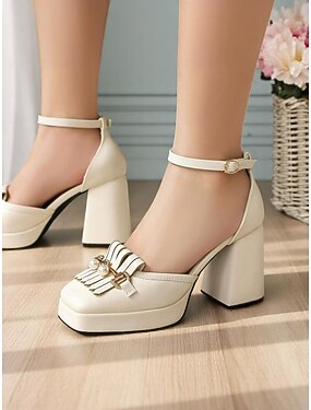 Dameloafers med grov hæl fra 1950-tallet – kremfargede pumps i imitert skinn med rund tå, perlekvast og ankelstropp til bryllup, fester og formelle arrangementer