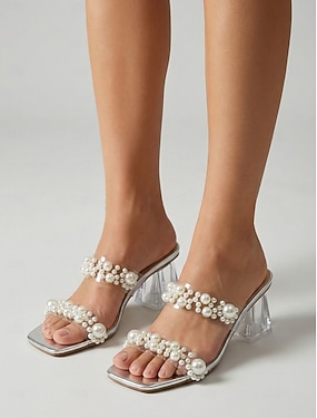 Elegante sølvfargede sandaler til dame med utsmykninger av imiterte perler – elegante, gjennomsiktige sandaler til kveldsbruk på resorter og strandbryllup &sommergallaer