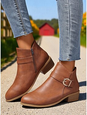 Brune ankelstøvletter i imitert skinn til dame – lavhælte støvletter med glidelås og spenne på siden for høstturer, turer på landet og hverdagsbruk