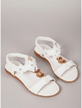 Hvite damesandaler med blondekant og blomsterdetaljer - åpen tå med lav hæl til brudesko til hage- eller strandbryllup