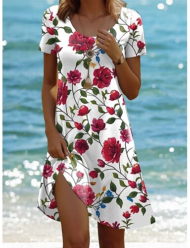 Dame Mini kjole T skjortekjole Solkjole Skiftkjole Kjole med A-linje Ferie Fritid Bohem Strand Fest Normal Blomstret Grafisk Kortermet Crew-hals Blå Hvit Rosa Rød Sommer Vår