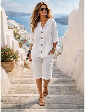 Dame Matchende sett Skjorter i bomullslin Skjortesett Shorts i bomullslin Shorts Strandshorts Casual shorts قميص Bland & Sammensett Antrekk 2stk Sport Gatemote عادي Daglig Halv-ermet Sommer Vår Snorer