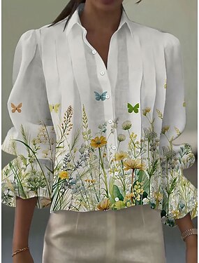 Dameskjorte i linlignende pustende lettvekt blomster grafikk elegant bohemia vintage lange ermer skjortekrage vanlige topper daglig arbeid ferie volang blå hvit rosa oransje sommer vår