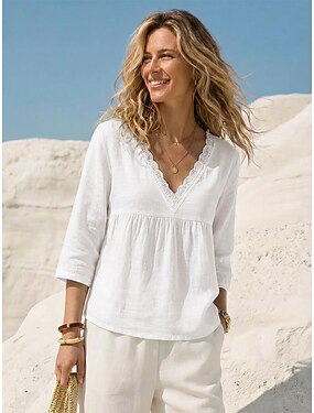 Dame Bluse Bomullsskjorte Blonde Lapper Helfarge Daglig Stilfull Grunnleggende 3/4 ermer V-hals Vanlige topper Daglig Blå Hvit Grønn Kakifarget Sommer Vår Høst