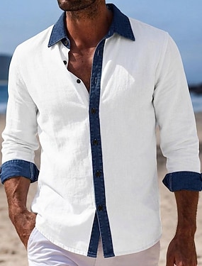 Herre Skjorte Linskjorte Sommerskjorte Strand Klær Strandskjorte Skjorte med knapper Fargeblokk Feriereise Ferie Blå Svart Hvit Rosa Langermet Aftæpning Sommer Vår Klær Lapper