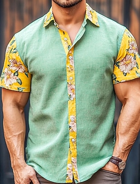 herreskjorte linskjorte St. Patricks dag sommerskjorte strandklær skjorte med knapper ensfarget avslappet strand korte ermer krage sommer vår &sommerklær klær fargeblokk