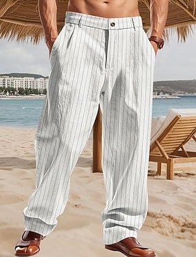 Herre Linbukser Bukser Sommerbukser Rett ben Stripet Komfort Pustende Full lengde Fest Virksomhet Strand Ferie Mote Svart Hvit