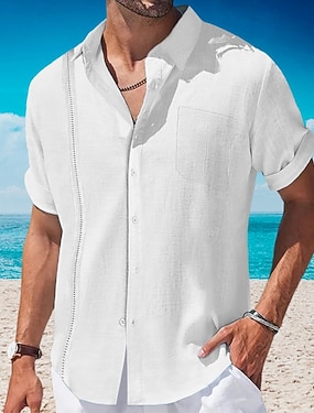 Herre Skjorte Linskjorte Guayabera skjorte Popover skjorte Sommerskjorte Strand Klær عادي Feriereise Avslappet Hvit Navyblå Blå Kakifarget Kortermet Krage Sommer Klær