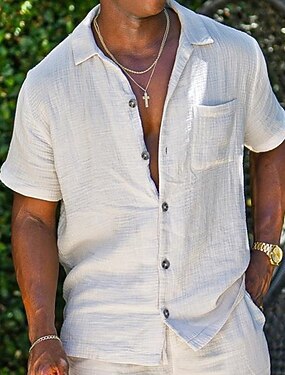 Herre Skjorte Linskjorte Sommerskjorte Strand Klær Skjorte med knapper Seersucker skjorte Helfarge Feriereise Gate Hvit Rosa Kakifarget Kort Erme Skjortekrage Sommer Vår Klær