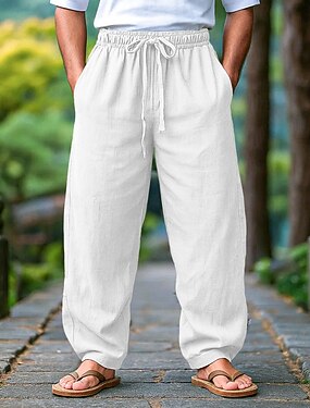 Herre Linbukser Bukser Sommerbukser Snorer Elastisk midje Bred Bukseben عادي Komfort Pustende Full lengde Avslappet Daglig Ferie Ferie Mote Løstsittende Gresskar Hvit Uelastisk