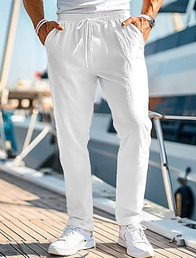 Herre Linbukser Bukser Sommerbukser Posete bukser Strandbukser Snorer Elastisk midje Rett ben عادي Komfort Pustende Full lengde Avslappet Daglig Ferie Ferie Mote Hvit Navyblå