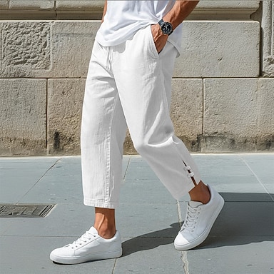 Herre Linbukser Bukser Sommerbukser Posete bukser Avskårede bukser Snorer Elastisk midje Helfarge عادي Komfort Pustende Ankel-lengde Avslappet Daglig Ferie Ferie Mote Svart Hvit Uelastisk