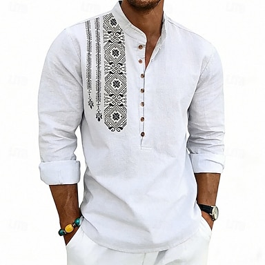 Herre Skjorte Linskjorte Popover skjorte Sommerskjorte Strandskjorte Geometrisk Avslappet Feriereise Svart Hvit Rosa Navyblå Langermet Høy krage Sommer Vår Klær Knapper