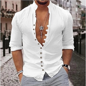 Herre Skjorte linskjorte Skjorte i bomullslin Hvit bomullsskjorte Skjorte med kinesisk krage Mandarin skjorte med krage عادي Feriereise Avslappet Hvit Langermet V-hals Vår & Vinter Klær