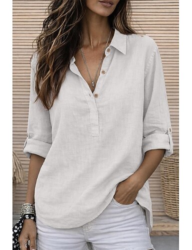 Dame Skjorte Skjorter i bomullslin Popover skjorte Strandskjorte Helfarge عادي Ferie Mote Fritid Langermet Crew-hals Vanlige topper Gateklær Strand Ferie Hvit Sommer Vår Høst