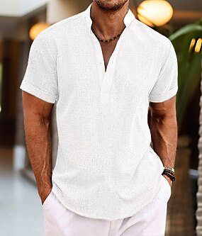 Herre Skjorte Linskjorte Popover skjorte Sommerskjorte Strand Klær Skjorte med bandkrage عادي Feriereise Avslappet Svart Hvit Gul Rosa Kortermet Henley Sommer Klær