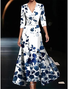 Dame Maxikjole Uformell kjole Swingkjole Kjole med A-linje Fritid Daglig Normal Blomstret 3/4 ermer V-hals Hvit Champagne Rød Vår Høst