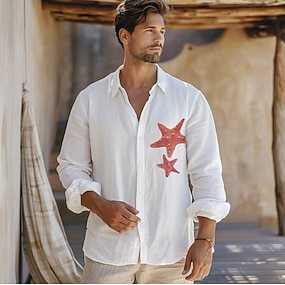 Herre Skjorte Skjorte i bomullslin Sjøstjerne utendørs Feriereise Hvit Himmelblå Langermet Rullekrage Sommer Vår Klær Knapper