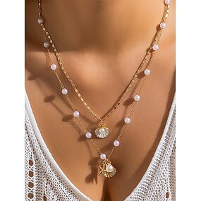 Dame sommerstrandkjede med perle-, skjell- og sjøstjerneanheng – gullbelagt lagdelt halskjede for ferie, uformelle antrekk og spesielle anledninger