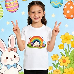 Påske jente-T-skjorte med 3D-grafikk og kanin, korte ermer, 3D-trykk, sommer, vår, sport, mote, gateklær, barn 4-12 år, rund hals, avslappet, daglig, utendørs, normal passform