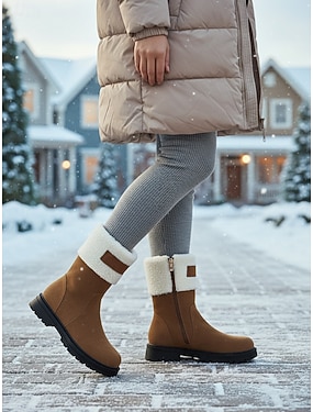 Brune vinterstøvler i semsket skinn til dame med mansjetter i imitert saueskinn og glidelås i siden, stilig urbant fottøy for kaldt vær