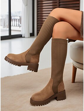 Brune knehøye sokkestøvletter til dame med kraftig hæl, elastisk strikk og en kombinasjon av semsket skinn og imitert skinn for stilig fritidsbruk