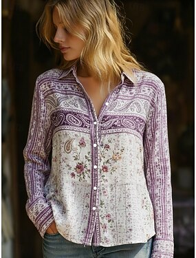 Dame Skjorte Boho skjorte Imitert bomullslin Knapper Trykt mønster Blomstret Paisly Bohem Aktiv Fritid Langermet Skjortekrage Vanlige topper Daglig Ferie Lilla Vår Høst