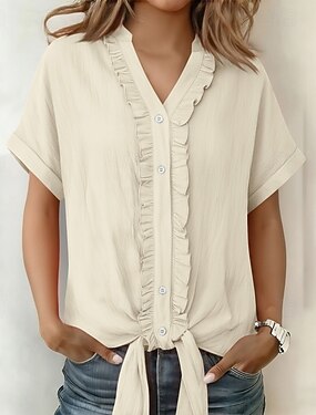 Kvinnens linlignende faux bomull lin skjorte uformell skjorte knappe skjorte med rynker volanger knapper ensfarget enkel daglig stilfull uformell kort erm stå krage ferie strand klær ferie klær