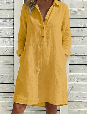 Dame Knelang kjole Kjoler i bomullslin Skjortekjole Mote Moderne utendørs Feriereise Ferie Normal عادي Langermet Skjortekrage Hvit Gul Navyblå Sommer Vår