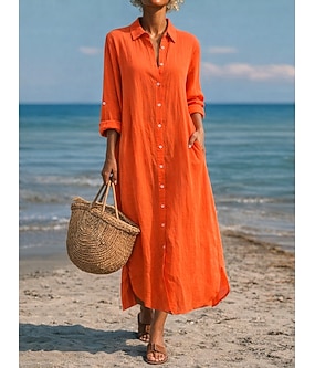 Kvinners bomull og lin maxi-kjole skiftkjole uformell daglig løs passform ensfarget lang erme krage blå svart hvit lys grønn sommer vår høst