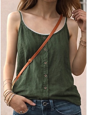 Dame T skjorte Imitert bomullslin T-skjorte Knapper عادي Mote Stilfull Klassisk Ermeløs stropper Vanlige topper Daglig Ut på byen Helg Grønn Sommer Vår