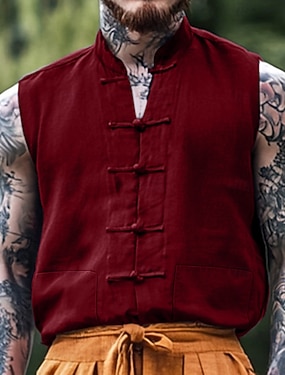 Herre Skjorte Linskjorte Sommerskjorte Strandskjorte Helfarge Feriereise Gate Svart Rød Navyblå Kakifarget Ermeløs Kinesisk Krave Sommer Vår sommer Klær Knapper