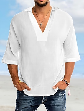 Herre Skjorte Skjorte i bomullslin Hvit bomullsskjorte Sommerskjorte Uformell skjorte Strandskjorte عادي Feriereise Avslappet Hvit Rosa Blå Kortermet V-hals Vår sommer Klær