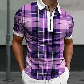 Herre Ruter Poloskjorter med glidelås Golf skjorte Kortermet Poloskjorter Skjorter med krage Fritid Ferieklær Formell klær Festivalklær 3D-utskrift Kvart zip-polo Sommer Vin Lilla