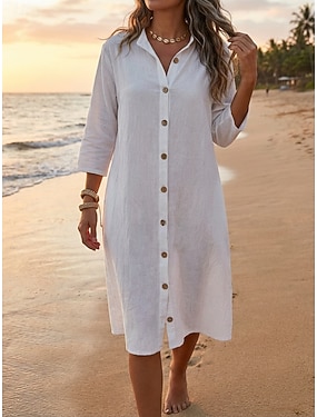 Dame Knelang kjole Imitert bomullslin Skjortekjole Mote Moderne Daglig utendørs Feriereise Normal عادي Halvlange ermer Skjortekrage Svart Hvit Grønn Sommer Vår