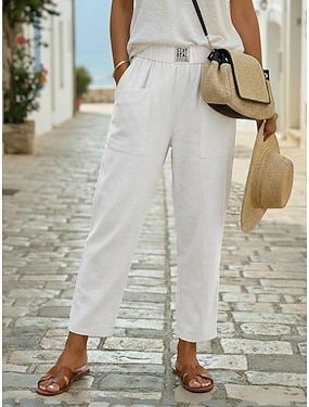 Dame Full lengde Lin Høy Midje Elegant Fritid Dagligdagstøy Hvit Sommer XS S M