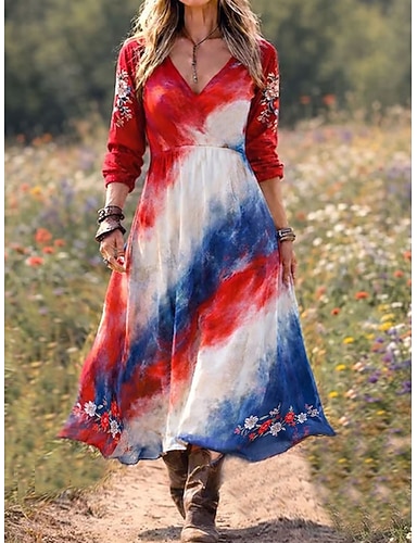 Uavhengighetsdag Patriotisk Kvinne Midi Kjole Uformell Kjole Fest Uformell Boho Date Regelmessig Passform Grafisk Abstrakt Lange Ermer V-hals Rød Sommer Vår