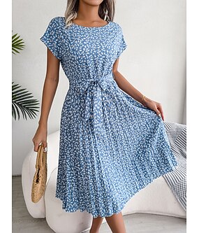 Dame Midikjole Uformell kjole Kjole med A-linje Stilfull Fritid Feriereise Daglig Normal Blomstret Kortermet Crew-hals Rosa Lyseblå Sommer Vår